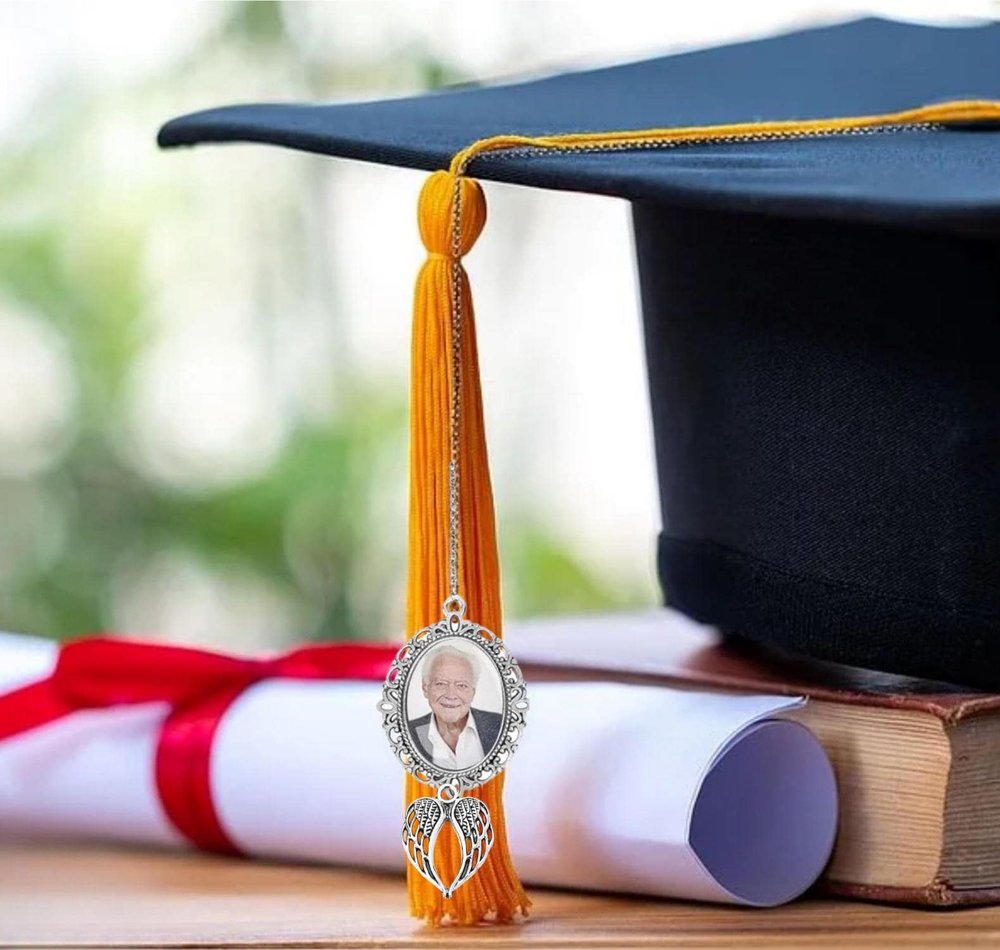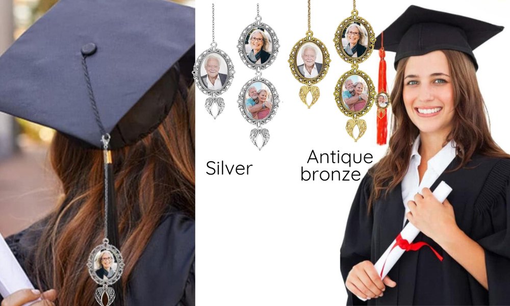 Crafted with intricate metal detailing and a soft tassel, this charm attaches easily to your graduation cap tassel. The photo frames securely hold your cherished images, while the angel wing motif adds a gentle, symbolic touch of protection and remembrance.