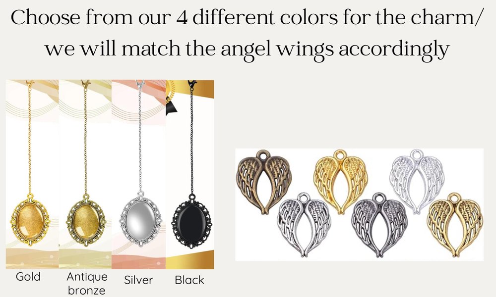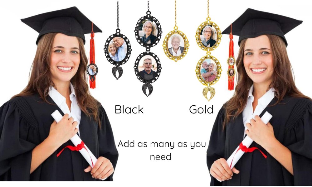 Choose your preferred charm color - Gold, Silver, Antique Bronze, or Black; add 1-5 photos of a loved one who could not attend the graduation ceremony, and tie it to your graduation cap to have her/him accompany you on your special day. You may also customize the graduation year to make this keepsake even more personal and memorable. A custom charm is the perfect way to remember a loved one who has passed away on your special day. Each charm comes with angel wings that will be custom-matched to your chosen charm color at no additional cost, adding a beautiful and meaningful touch.