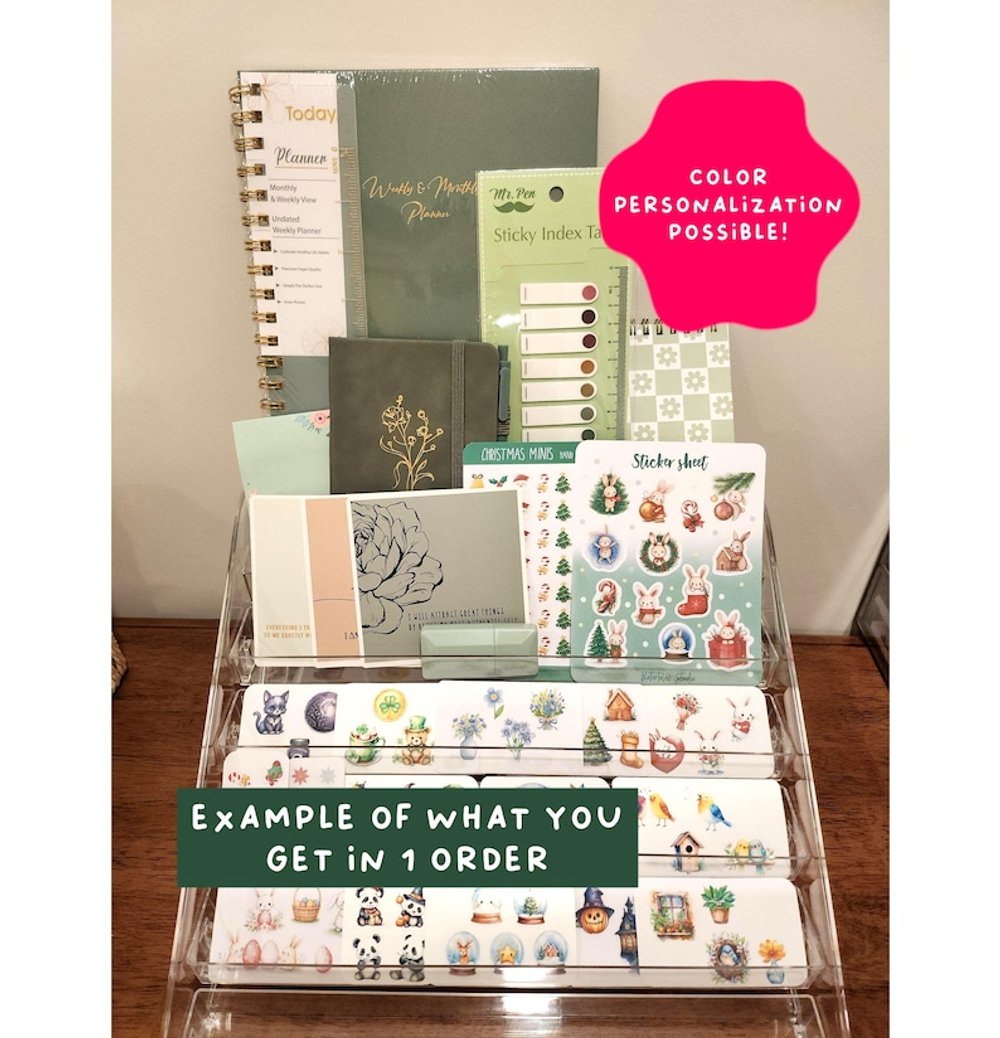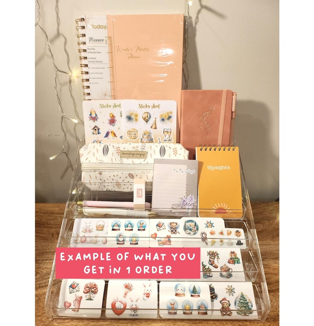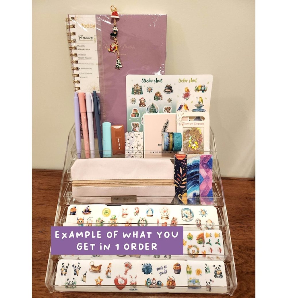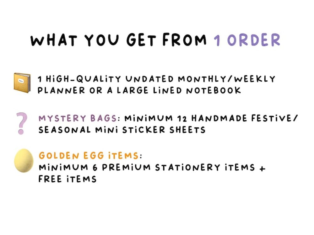 This stationery bundle comes with a beautiful undated monthly & weekly planner or a large lined notebook, high-quality stationery goodies, and bunch of festive and seasonal handmade stickers. Test your luck today to see what items you can get :)