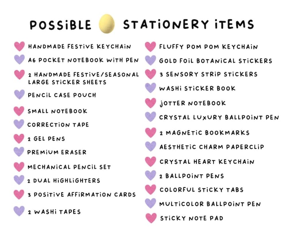 At the end of your bag openings, your number of Goose Charms = number of Golden Eggs. Each egg can give you one stationery item. Please check the listing photos for the full list of items. These are high-quality, aesthetic stationery items. There will be no duplicate unless your order covers all eggs.