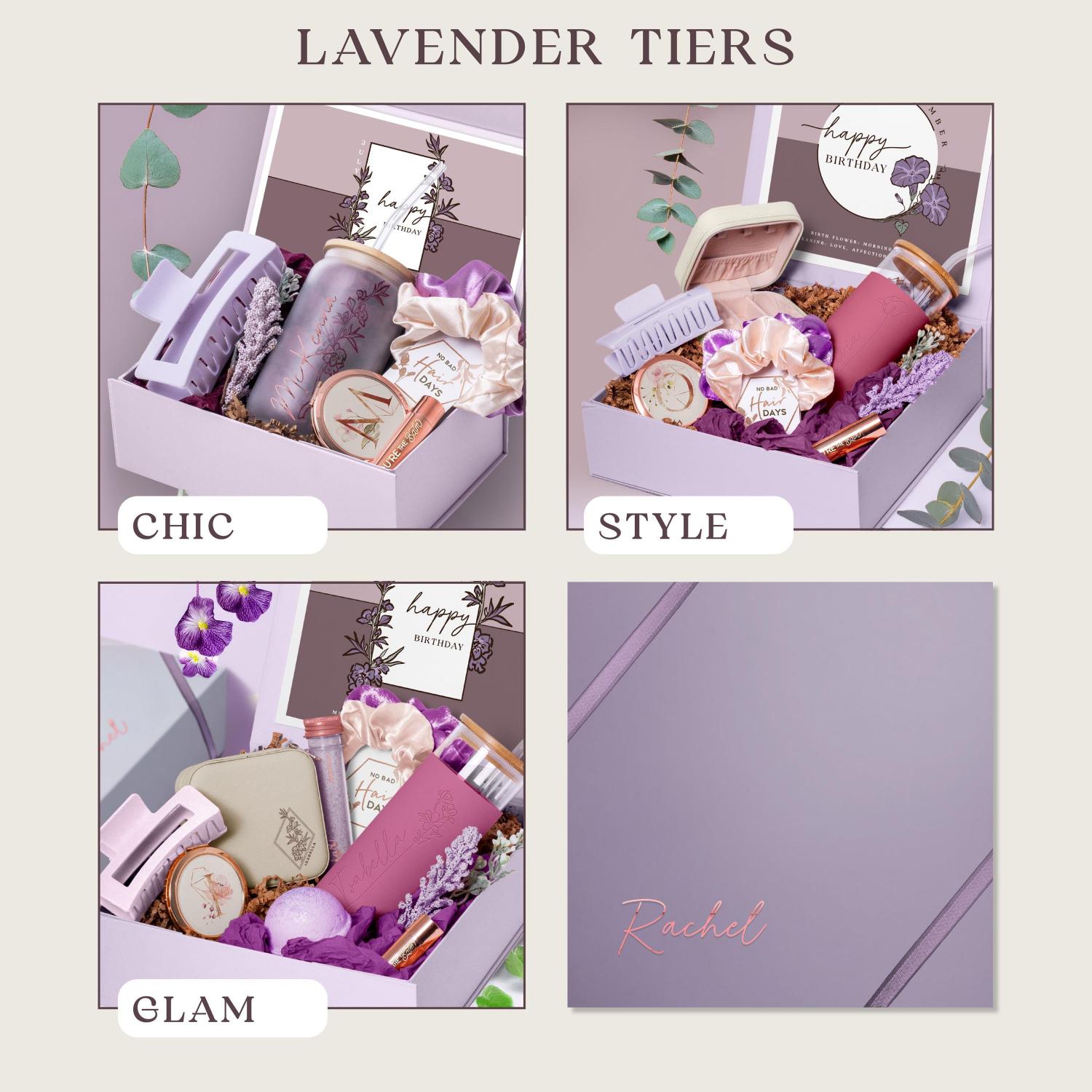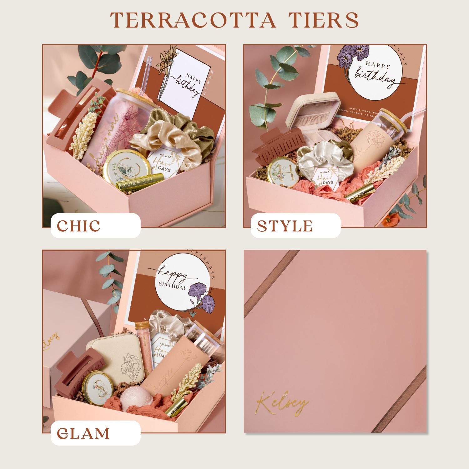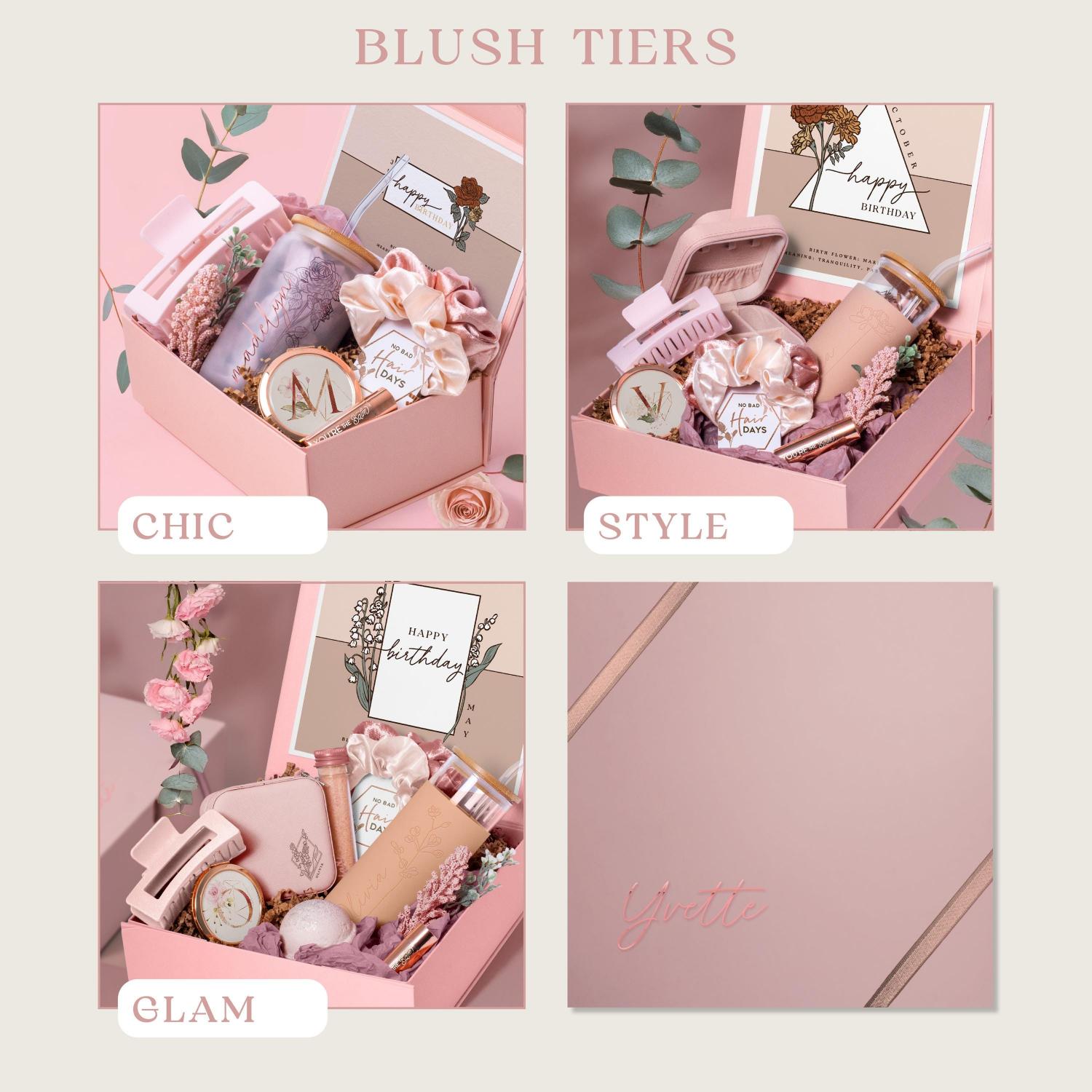 The sets come with a matte smooth hair claw, velvet and satin scrunchie set, metallic compact with their initial, and a matching metallic lip balm for keeping their lips hydrated. Color-coordinated floral spikes and tissue paper round out the design to give a full, earthy feel.