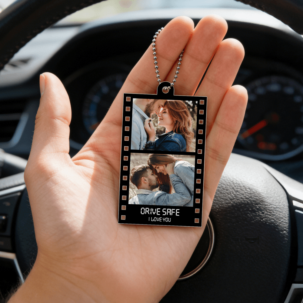 This pendant features a classic movie film strip style, allowing you to showcase your most cherished couple photos romantically and nostalgically. Each image is beautifully arranged and accompanied by the sweet message, "Safe travels, I love you," creating a unique narrative. This design not only catches the eye but also adds an artistic touch, making it more than just a decorative item—it symbolizes love itself.
