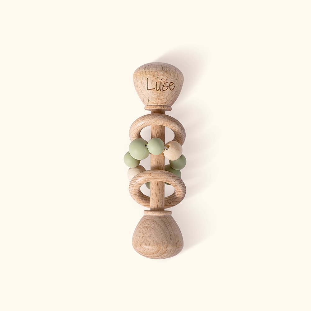 Make this rattle truly special by adding a personal touch. The engraved name on the wooden rattle adds a sentimental and personalized element, turning this toy into a cherished keepsake. It's a wonderful way to celebrate baby's arrival and create a lasting memento that exclusive to your little one.
