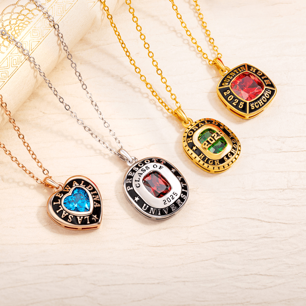 Our birthstone necklaces are crafted to honor graduates and celebrate achievement. The pendants come in 4 different styles, all with a birthstone of your choice that symbolizes the wearer's unique qualities, such as sapphires for wisdom and loyalty, and rubies for passion and love. You can also add text and your graduation year to make this a memorable keepsake to share with friends or classmates.