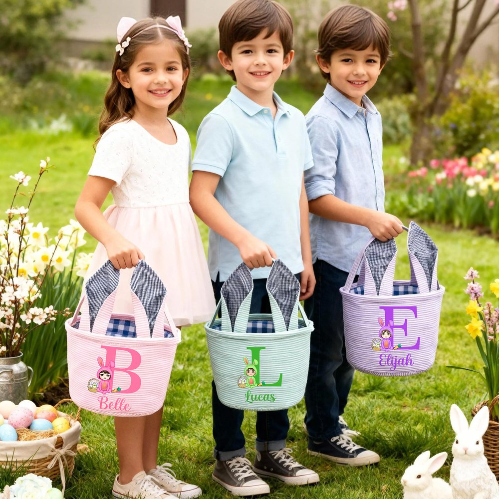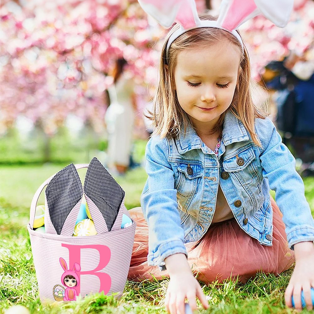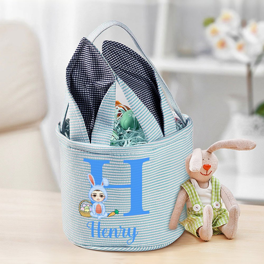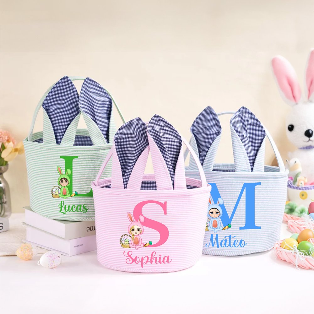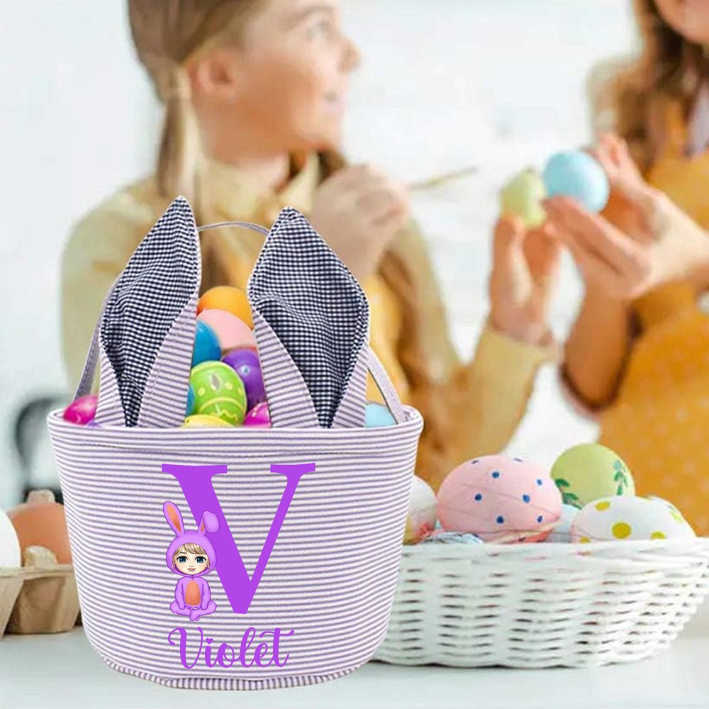 The Easter basket features an adorable bunny design, complete with rabbit ears and striped details, exuding a lively and cute festive atmosphere that perfectly captures children's aesthetic. Customize a bunny onesie cartoon character, an initial, and a name, seamlessly blending personalization with the Easter theme to make each basket a unique item for your kids.