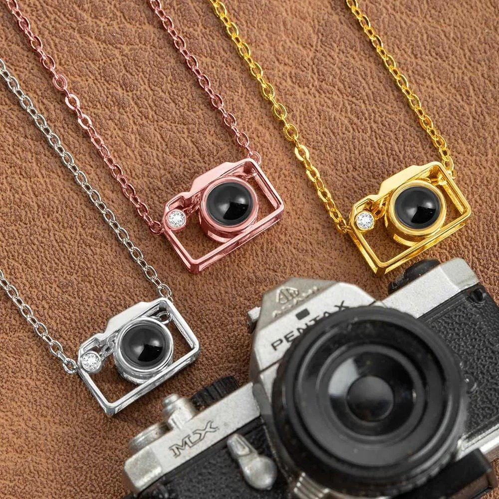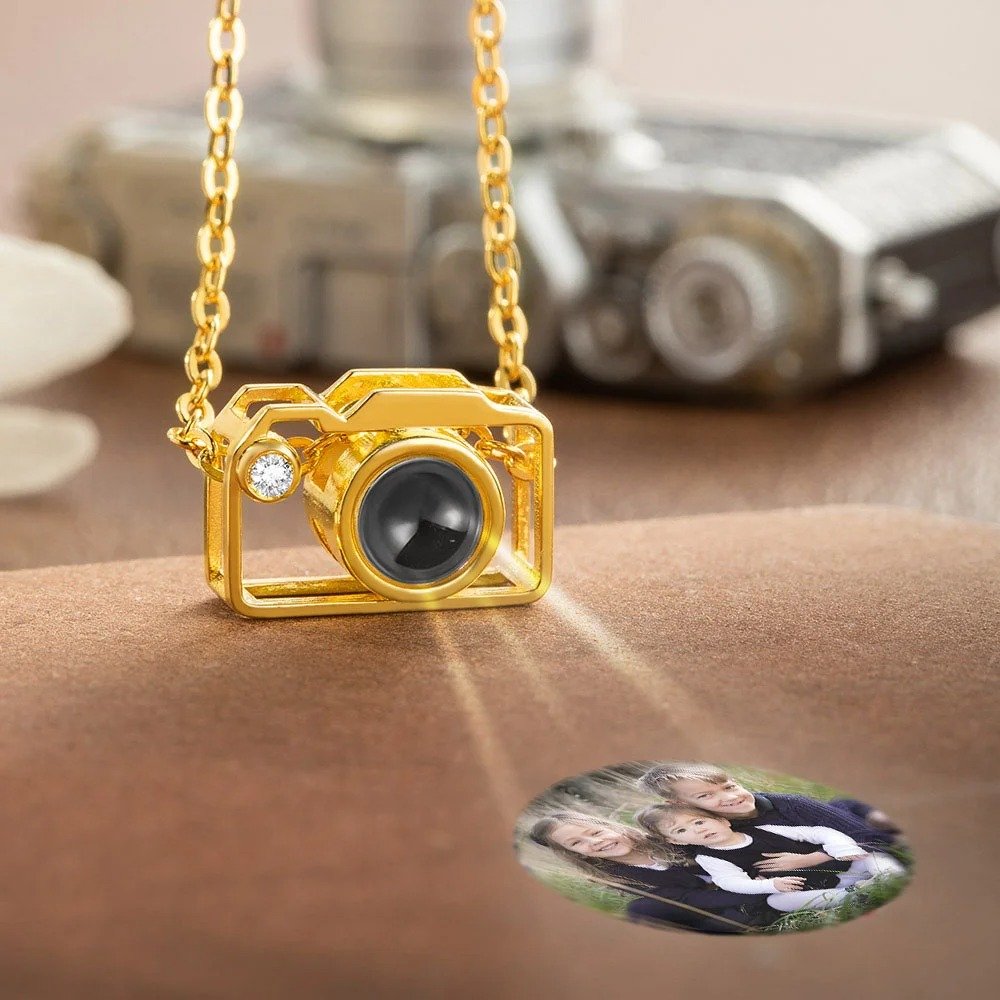 This necklace with a camera charm pendant and is available in silver, gold, and rose gold. The pendant is inlaid with a projection stone and can engrave any photo in the middle of the projection stone. Put the photo inside the camera pendant when they see the photo, they will remind of the good times. This tiny camera pendant is delicate and simple, perfect for stacking or layering with other jewelry.