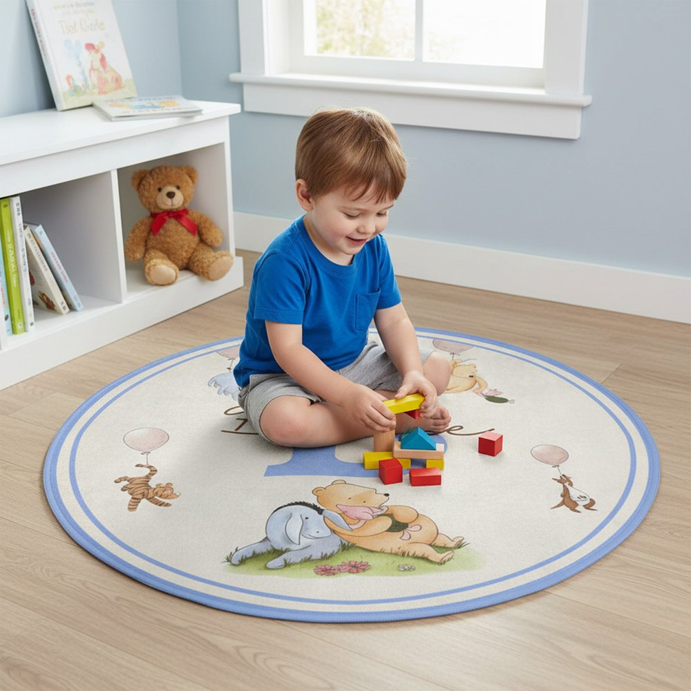 Featuring timeless Winnie the Pooh artwork in soft storybook colors, this round mat adds a gentle, nostalgic feel to any room. Its cozy fleece surface and cheerful design create an inviting spot for play, reading, or cuddle time.