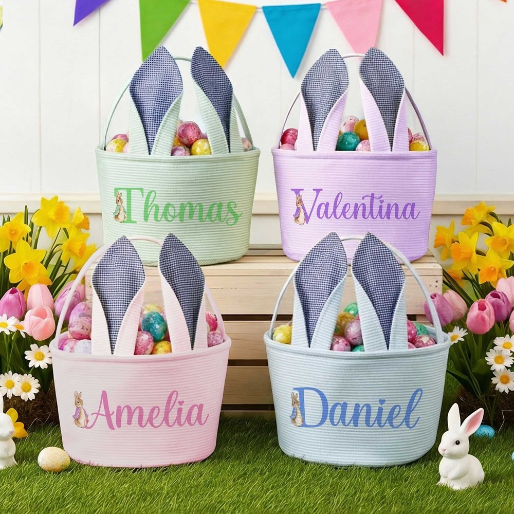 Make this Easter basket uniquely your child’s: pick from 4 cheerful colors, choose Peter Rabbit patterns, then add a custom name — turning a basic Easter container into a personalized treasure that feels made just for them.