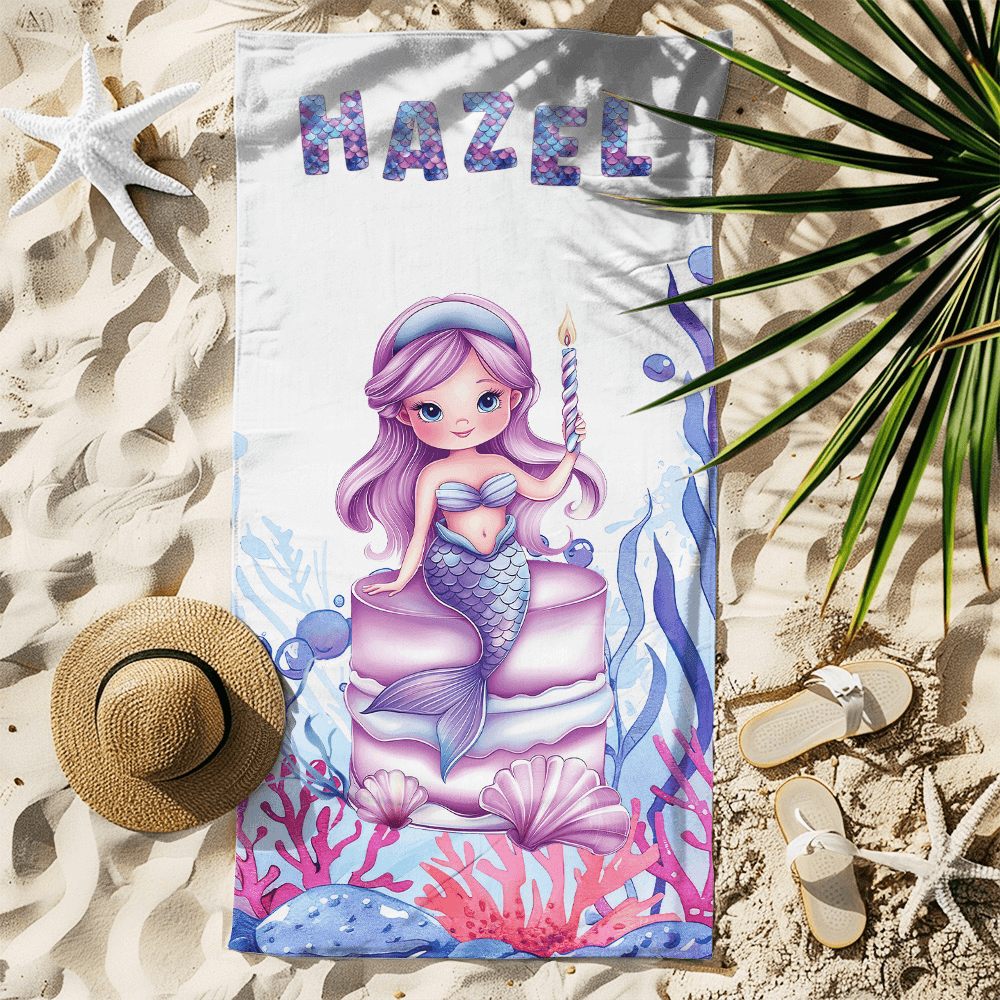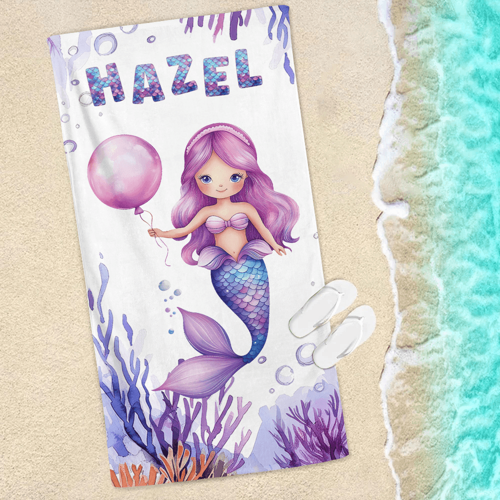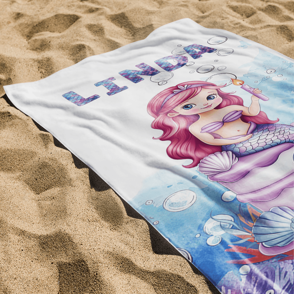 This beach towel is inspired by a dreamy mermaid girl, combining fish-scale texture fonts with marine elements to present a fantasy beauty that seems to come from a fairy tale world. The beach towel surface can be customized with her name, making each beach towel unique and memorable.