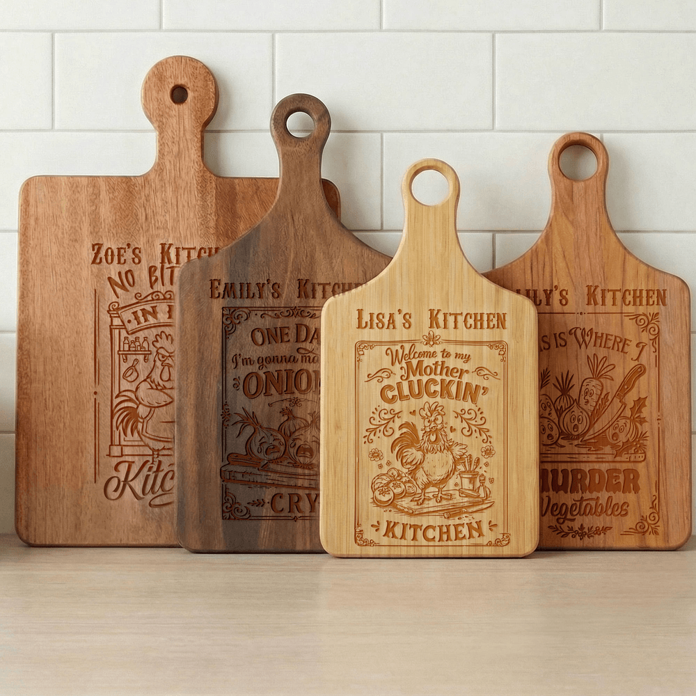 This collection features 15 carefully selected, humorous kitchen illustrations that are customizable with your name. The style is warm, comforting, and playful. Available in four materials and colors: walnut, bamboo, mahogany, and cherry wood, each offering a unique blend of rustic charm and personal style.