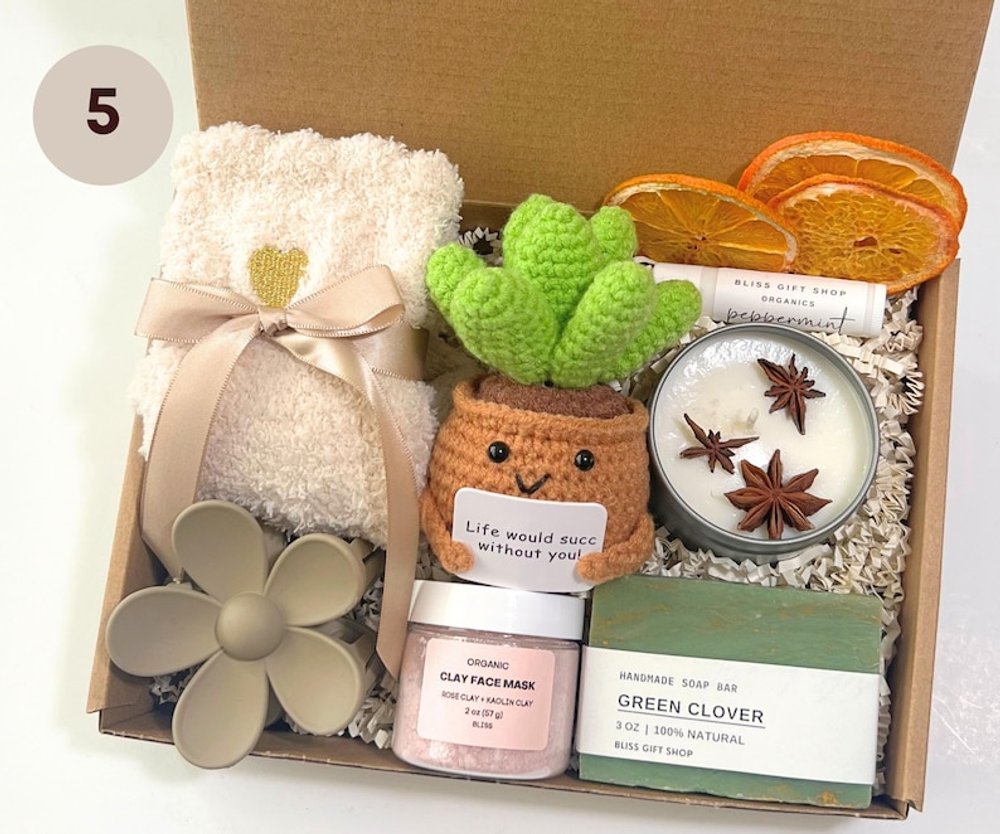 1. Organic Handmade Soap (3 oz) Royal Garden | Geranium Grapefruit | Green Clover | Lavender | Lovespells 2. Flower Claw Clip | Silk Satin Extra Large Scrunchie 3. Crochet Succulent in a Pot 4. Organic Peppermint Tea Tree Lip Balm 5. 100% Organic Soy Wax Candle (Lemon Eucalyptus) 6. California Orange Crisps (7-8 slices) 7. Pair of Cozy Chenille Socks | Premium Fuzzy Socks 8. Organic Clay Face Mask (2 oz) 9. Gift Box (9x6x2 inches) tied with beautiful ribbon 10. Greeting Card