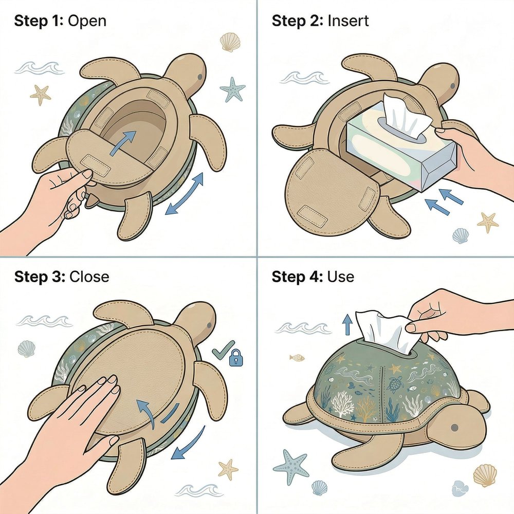 Crafted from soft, durable PU eco-friendly leather with a smooth, leather-like finish, this tissue holder is both stylish and practical. Designed to fit standard square tissue boxes, it measures approximately 30 cm (length) × 22 cm (width) × 12 cm (height). The high-definition flat print (non-embossed) ensures crisp, lasting details — from the turtle’s shell to the ocean waves.
